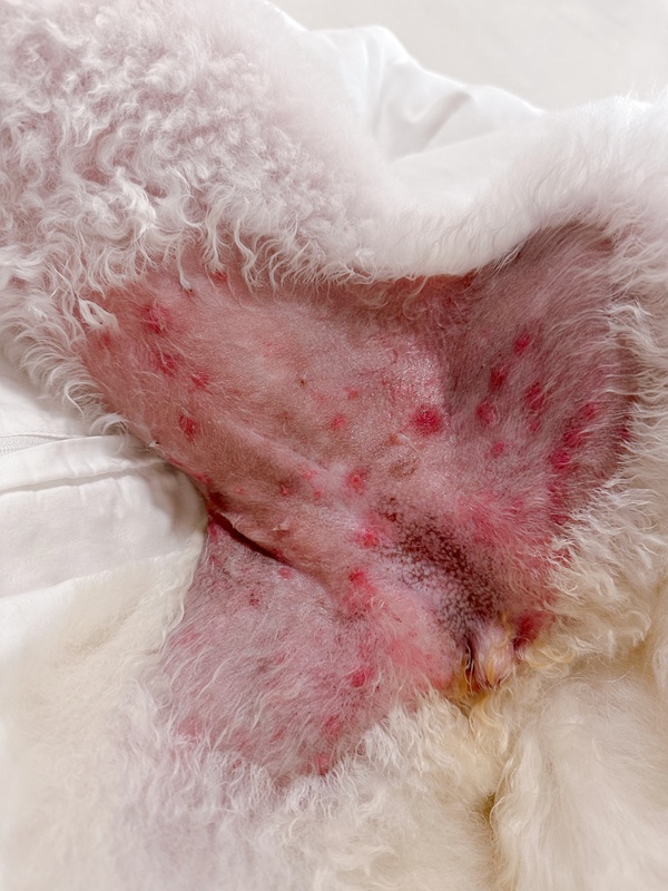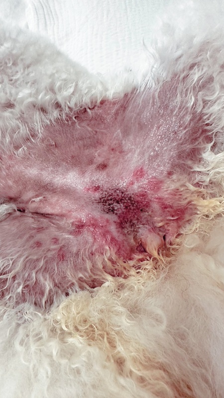 まずは、2歳の頃です。背中の真ん中におできのような物が出来て、破裂してしまいました。毎日ブラッシングしていたにも関わらず、破裂するまで気づきませんでした。写真からもわかるように、結構な大きさでした。写真が残っていなかったのですが、脇のあたりにもおできのようなものが良く出来ていました。