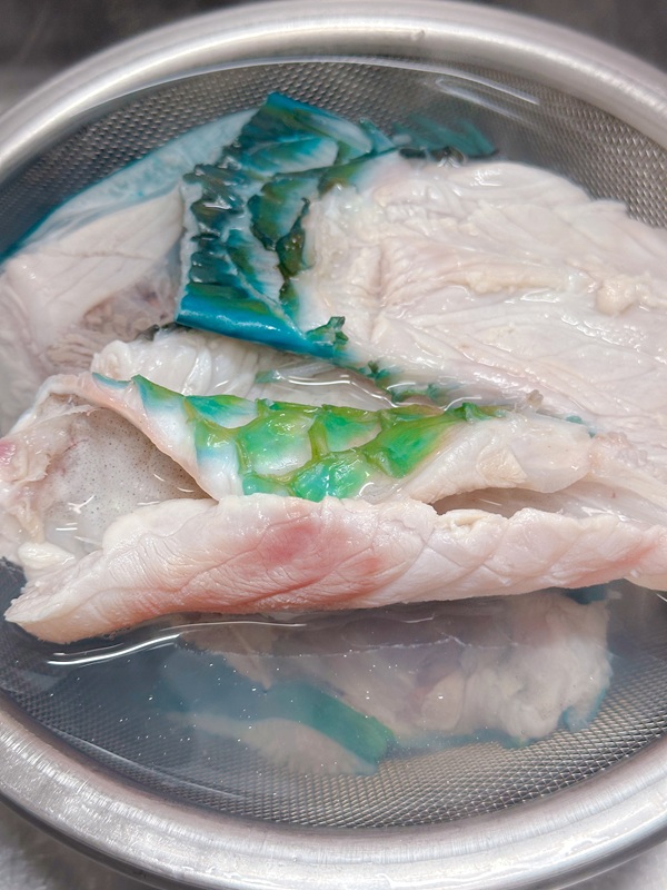 まずは、煮る前に、お湯をかけた後、流水でぬめりや汚れを取り除きます。