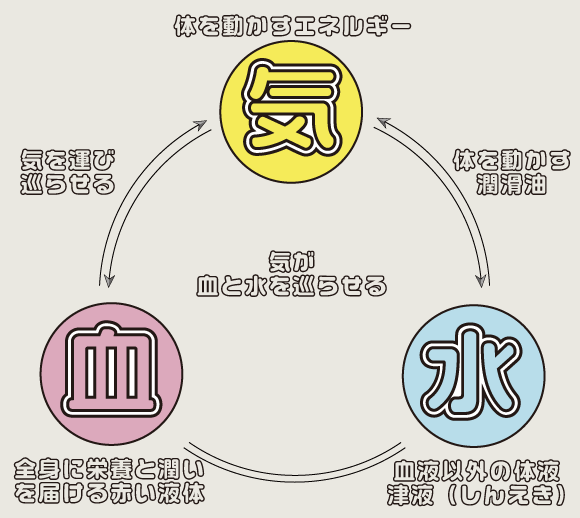 気が血を動かし、血が体を養い、水がその流れをなめらかにする。